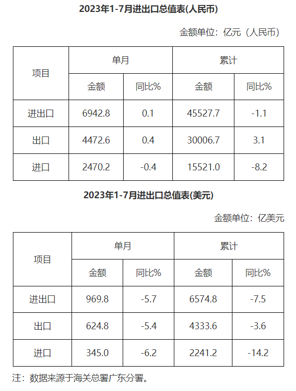 廣東省外貿(mào)進出口總值表(2023年1-7月)