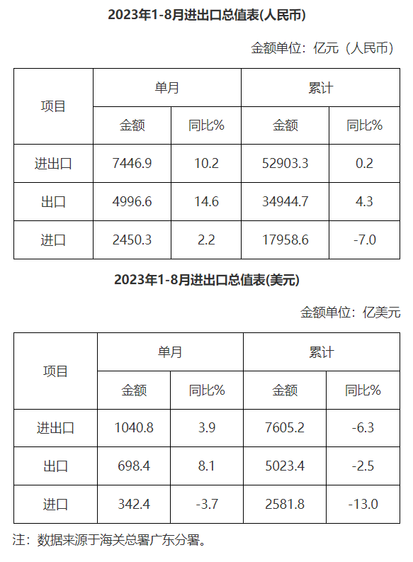 廣東省外貿進出口總值表(2023年1-8月)