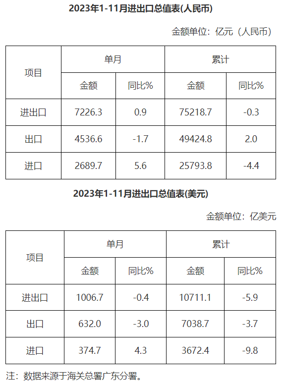 廣東省外貿進出口總值表(2023年1-11月)