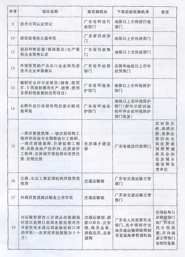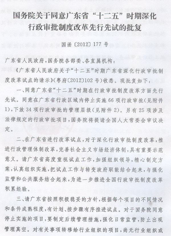 ? 廣東省人民政府轉發(fā)《國務院關于同意 廣東省“十二五”時期深化行政審批 制度改革先行先試的批復》的通知 ? 各地級以上市人民政府,各縣(市、區(qū))人民政府,省政府各部門、各直屬機構: 現將《國務院關于同意廣東省“十二五”時期深化行政審批制度改革先行先試的批復》(國函〔2012〕177號)轉給你們,并結合我省實際提出以下意見,請一并認真貫徹執(zhí)行。 一、積極穩(wěn)妥做好實施工作 各地、各部門要結合當前正在推進的各級行政審批制度改革工作,抓緊制訂具體實施方案,明確實施時間、任務和進度安排等,確保行政審批項目取消和調整工作及時落實到位。 (一)關于國務院同意在我省行政區(qū)域內停止實施的行政審批事項。 對國務院同意在我省行政區(qū)域內停止實施的行政審批事項,原實施機關自本通知下發(fā)之日起停止實施,不得變相審批。 對國務院同意在我省行政區(qū)域內政府部門不再實施、轉移給具備條件的行業(yè)組織實行自律管理的事項,要根據國函〔2012〕177號文規(guī)定的具體內容,結合省編委《政府向社會轉移職能工作方案》(粵機編〔2012〕22號)有關要求,分類分步轉移,積極穩(wěn)妥有序推進,確保相關事項“轉得出、接得穩(wěn)”。已經具備條件的事項,要立即實施轉移;基本具備條件的事項,要制訂分步驟分階段工作安排,逐步實施轉移;暫不具備條件的事項,要加快培育行業(yè)組織,設定一定過渡期并明確過渡期內的管理安排。各部門要就每項轉移事項制訂實施方案,報本級機構編制部門或行政審批制度改革牽頭部門審定。除需新成立行業(yè)組織后再實施轉移的事項外,其他轉移事項的交接工作爭取在2013年上半年基本完成。 (二)關于國務院同意下放管理層級的行政審批事項。 由國家部門下放到我省實施的行政審批事項,各地、各部門要積極主動與國家有關部門做好溝通銜接,爭取在2012年年底前完成交接工作,并在國家相關部門的指導下,依法開展行政審批。 對國務院同意我省下放到市、縣實施的行政審批事項,原實施機關要在2012年年底前與承接單位完成交接工作,并通過有效方式向社會公布交接日期、下放事項及權責關系等。在交接期間,原實施機關要繼續(xù)做好相關管理工作,防止交接過程中出現管理“真空”。原實施機關要加強對承接單位的業(yè)務培訓和指導,促進承接單位依法依規(guī)有序開展工作。行政審批事項下放后,實施機關為市、縣(市、區(qū))人民政府的,由市、縣(市、區(qū))人民政府確定具體實施部門。除另有規(guī)定外,佛山市順德區(qū)政府(部門)享有下放給地級以上市政府(部門)的權限。 二、切實加強監(jiān)管 在取消、調整行政審批事項的同時,要努力改變重審批、輕監(jiān)管的管理方式,加快推動政府部門工作重心向制訂標準規(guī)則和強化監(jiān)管轉移,管理方式由事前審批向事中、事后監(jiān)管轉變。各部門要根據省編委《關于加強對行政審批制度改革調整事項監(jiān)管的意見》(粵機編〔2012〕23號)有關要求,結合社會信用體系建設和市場監(jiān)管體系建設,針對取消、調整的行政審批事項,逐項制訂具體監(jiān)管辦法,切實履行好后續(xù)監(jiān)管職責,抓緊完善各領域、各環(huán)節(jié)的監(jiān)管制度和管理規(guī)范,強化監(jiān)管責任,落實監(jiān)管措施,防止監(jiān)管缺位。 三、加快培育發(fā)展和規(guī)范社會組織 按照省委、省政府《關于進一步培育發(fā)展和規(guī)范管理社會組織的方案》(粵發(fā)〔2012〕7號)有關要求,積極推進社會組織去行政化和去壟斷化,加大對社會組織發(fā)展扶持力度,擴大政府購買服務,鼓勵和引導社會組織更多地參與社會服務和社會管理事務,促進社會組織良性有序發(fā)展。加快構建社會組織綜合監(jiān)管體系,建立健全社會組織服務管理能力評估辦法,引導社會組織建立健全規(guī)范運作、誠信執(zhí)業(yè)、信息公開、公平競爭、獎勵懲戒、自律保障等機制。 四、推進行政審批標準化規(guī)范化建設 加快出臺《廣東省行政審批事項目錄管理辦法》,對行政審批事項實行目錄管理,建立行政審批事項動態(tài)清理調整機制。創(chuàng)新審批方式,建立和完善審批標準,優(yōu)化審批流程,簡化審批程序,嚴格規(guī)范行政審批自由裁量權。加快網上辦事大廳建設,推進網上審批、并聯審批和服務質量公開承諾,進一步健全行政審批服務體系,不斷提高行政審批服務水平。 五、加強組織領導 國務院批準我省“十二五”時期深化行政審批制度改革先行先試,對我省加快轉變政府職能,率先探索構建具有強大動力、充滿活力和可持續(xù)競爭力的行政體制機制,建設法治化國際化營商環(huán)境具有重大意義。各地、各部門要進一步統(tǒng)一思想,提高認識,把深化行政審批制度改革擺在突出位置,切實加強領導,健全工作機制,明確分工責任,精心組織實施,堅定不移地扎實推進。各地、各部門要于2013年1月底前將貫徹落實情況報送省轉變政府職能決策咨詢委員會辦公室(設在省編辦,下稱省轉職能辦)。省轉職能辦要牽頭加強對各地、各部門改革實施工作的監(jiān)督檢查,確保改革順利推進并取得明顯成效。 各地、各部門在貫徹實施過程中遇到的問題,請徑向省轉職能辦反映。 ? ? ? ? 廣東省人民政府 2012年11月20日 ? 