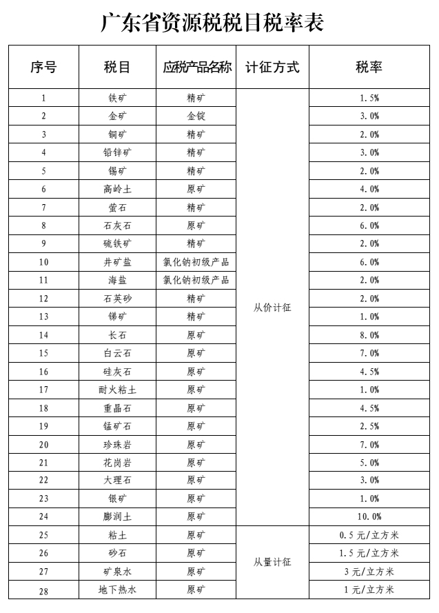 根據(jù)中央統(tǒng)一部署,自2016年7月1日起,我國(guó)全面推開資源稅改革。廣東省人民政府日前印發(fā)《關(guān)于實(shí)施資源稅改革的通知》稱,經(jīng)財(cái)政部、國(guó)家稅務(wù)總局核準(zhǔn)和備案同意,我省28個(gè)礦產(chǎn)資源品目納入資源稅改革范圍,其中鐵礦、金礦、銅礦、鉛鋅礦等24個(gè)品目由從量計(jì)征改為從價(jià)計(jì)征,對(duì)粘土、砂石(包括河沙、海沙和其他建筑用砂石)、礦泉水、地下熱水4個(gè)品目繼續(xù)實(shí)行從量計(jì)征。據(jù)悉,此次全面推開資源稅改革的主要內(nèi)容是從價(jià)計(jì)征、清費(fèi)立稅。按照稅費(fèi)平移、總體不增加企業(yè)稅負(fù)的原則,將礦產(chǎn)資源補(bǔ)償費(fèi)并入資源稅,改革后的資源稅稅負(fù)水平,與改革前資源稅和礦產(chǎn)資源補(bǔ)償費(fèi)合計(jì)負(fù)擔(dān)水平相當(dāng)。