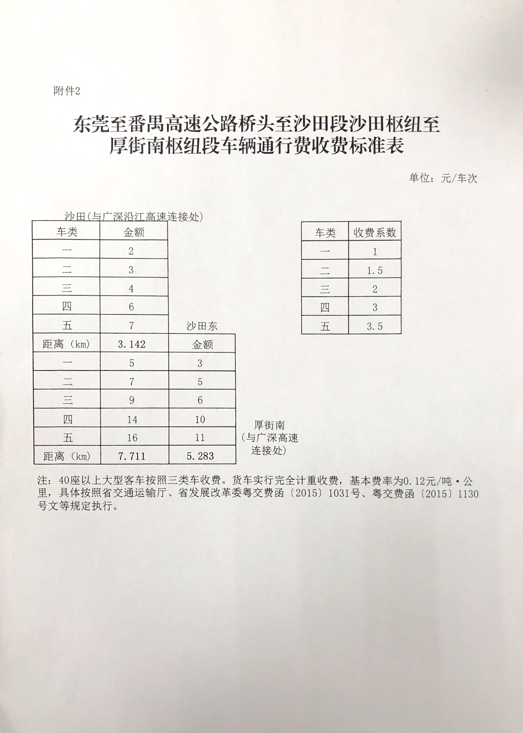 粵交費〔2019〕333號請示收悉。同意東莞至番禺高速公路橋頭至沙田段沙田樞紐至厚街南樞紐段交工驗收通車和收費站收費設(shè)施經(jīng)驗收符合省聯(lián)網(wǎng)收費技術(shù)要求后開始收費,收費車型按國家統(tǒng)一標(biāo)準(zhǔn)進(jìn)行分類,1至5類車的收費系數(shù)分別為1、1.5、2、3、3.5;貨車實行完全計重收費,基本費率為0.12元/噸·公里。